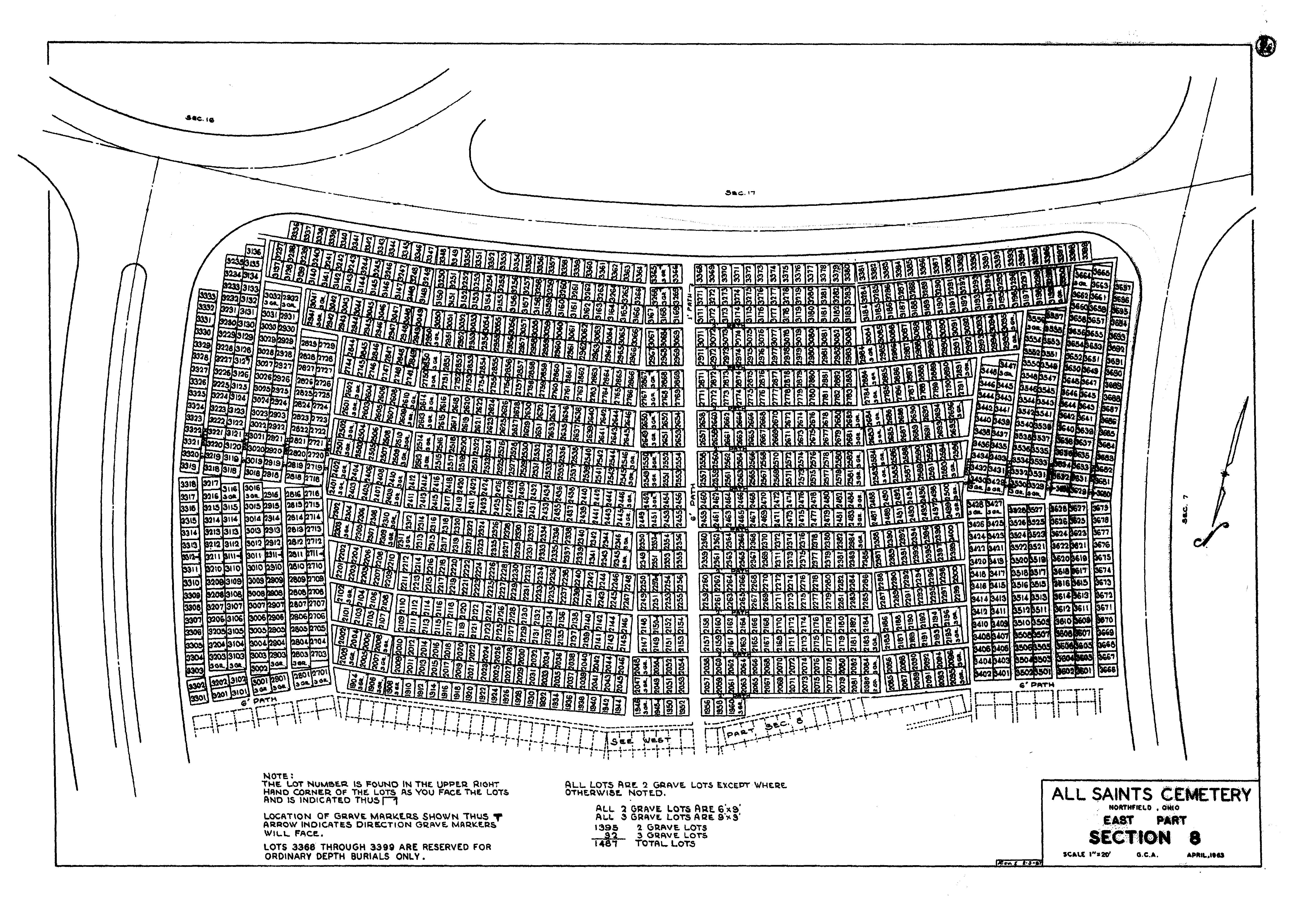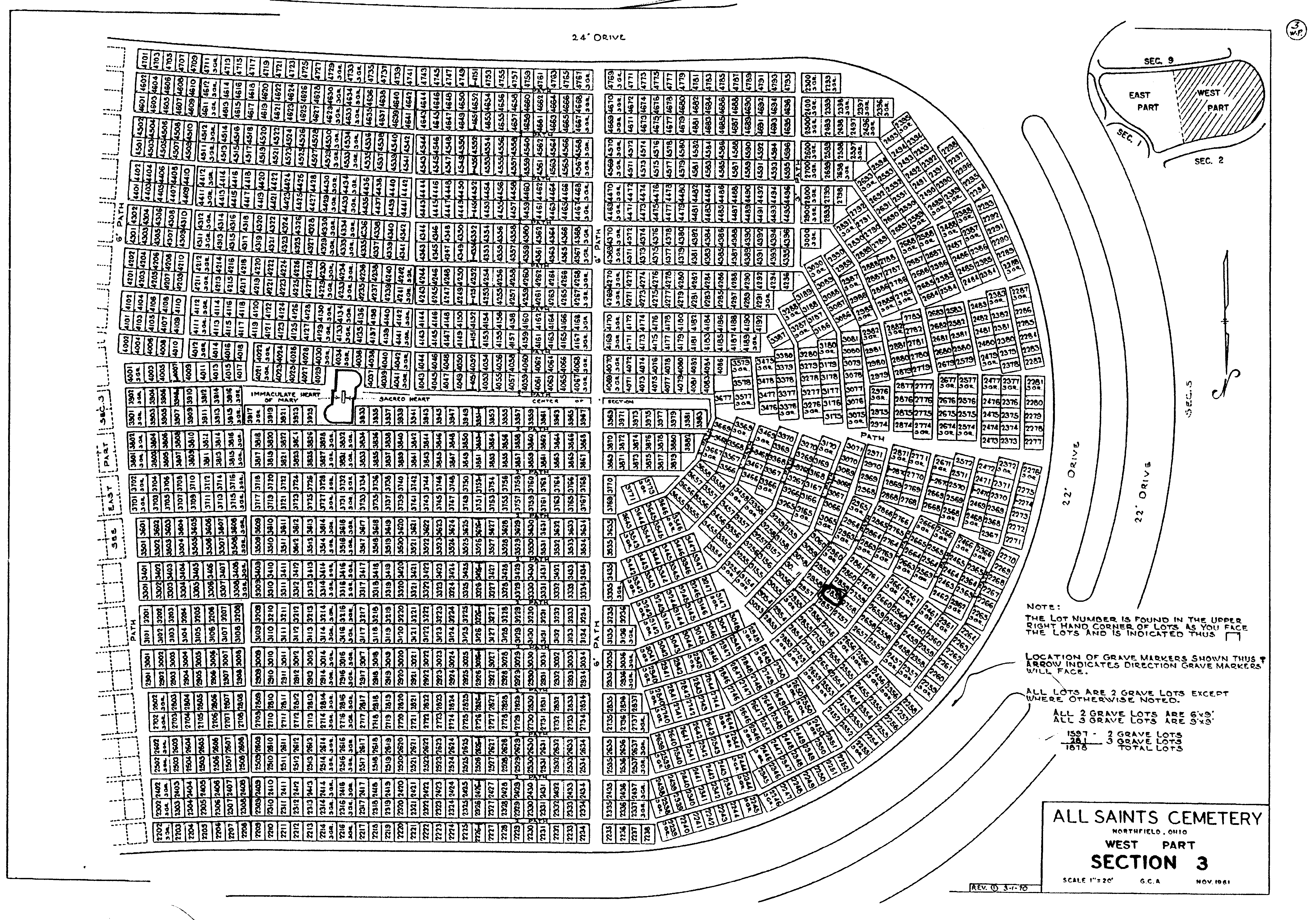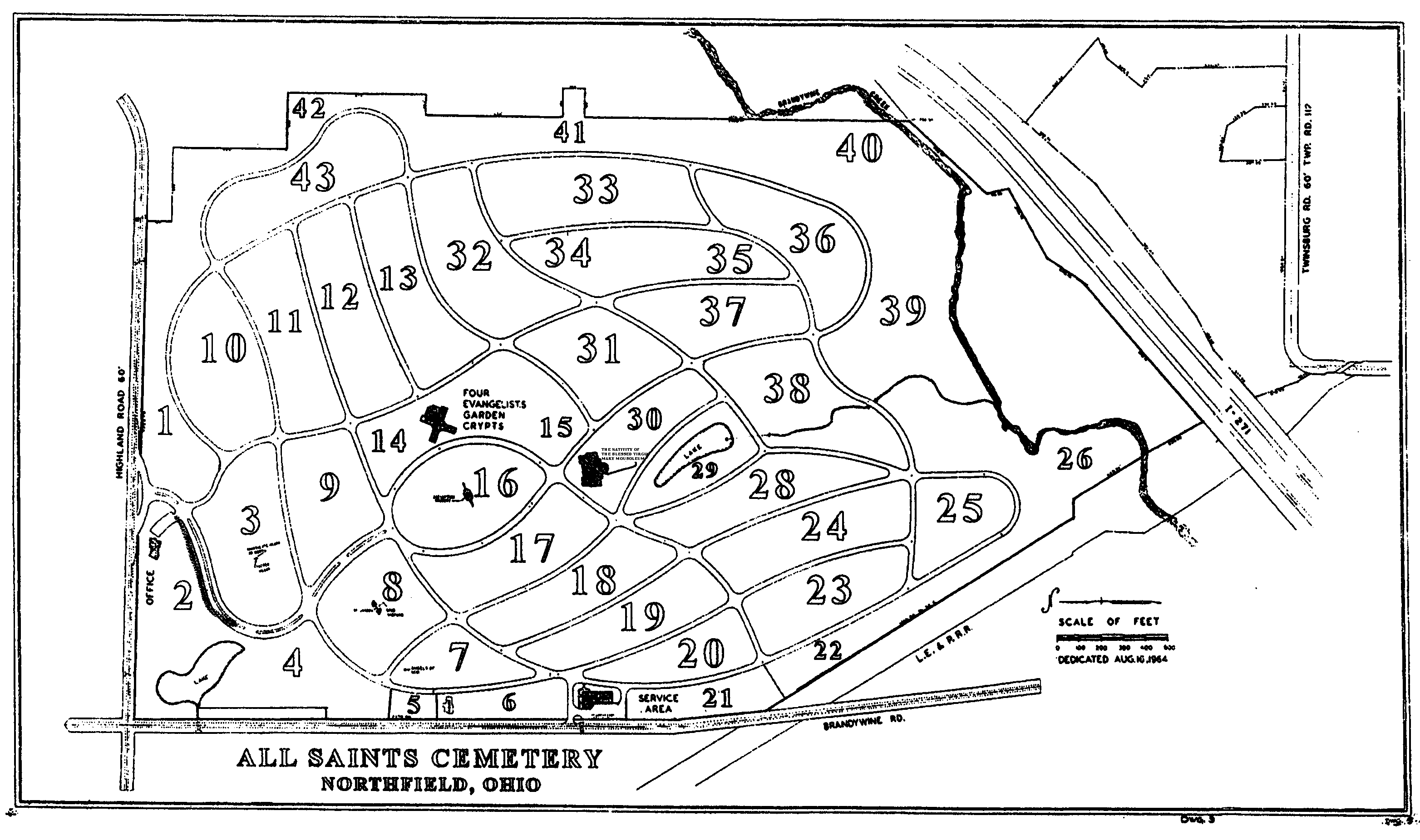All Saints has 43 sections spread over 271 acres.Color Plot Map, All Saints, Northfield, Ohio, USA