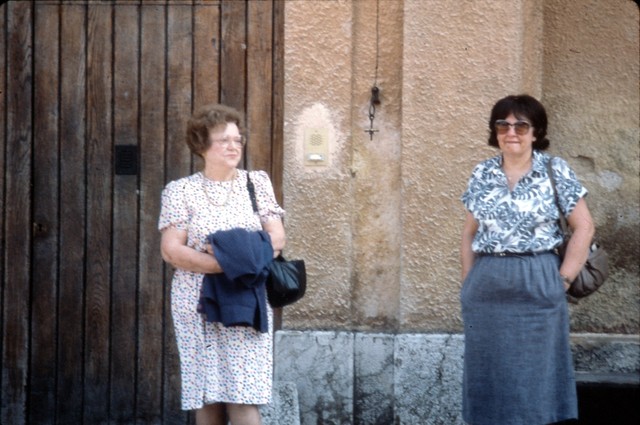 1985 Betty and Betty Ann in front of Pleterje Monastery front door