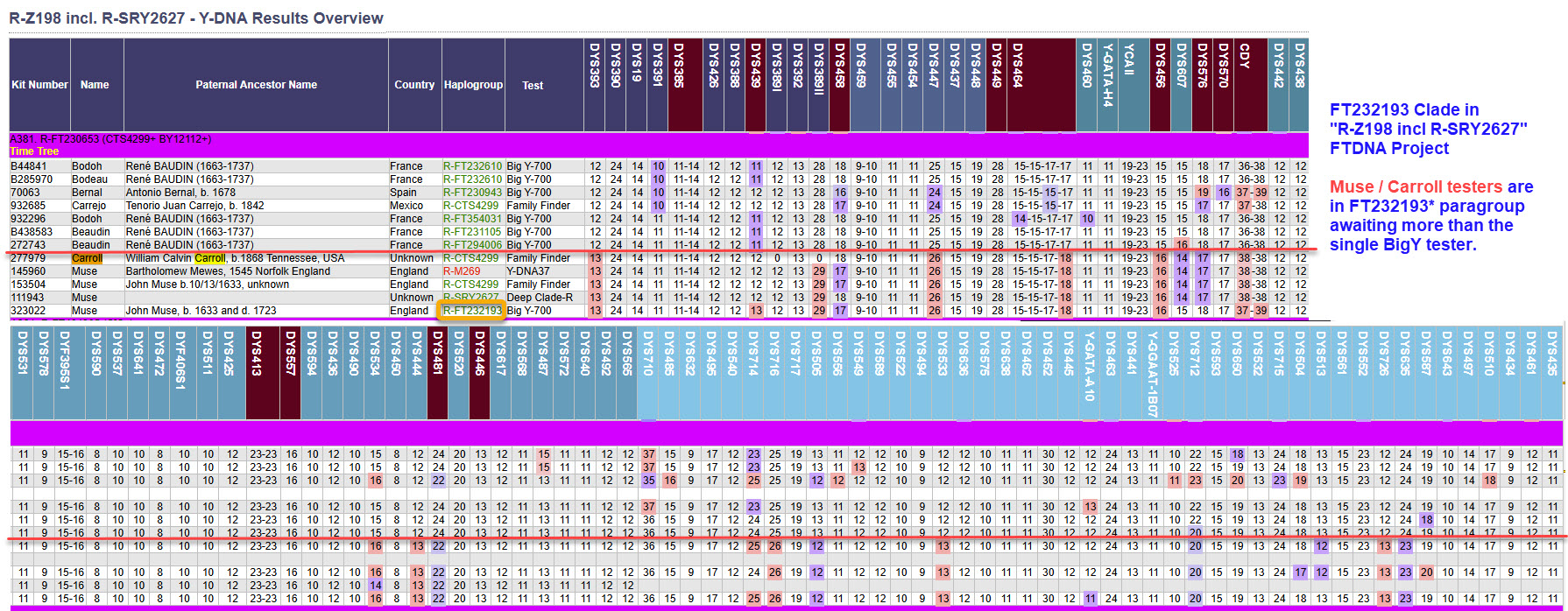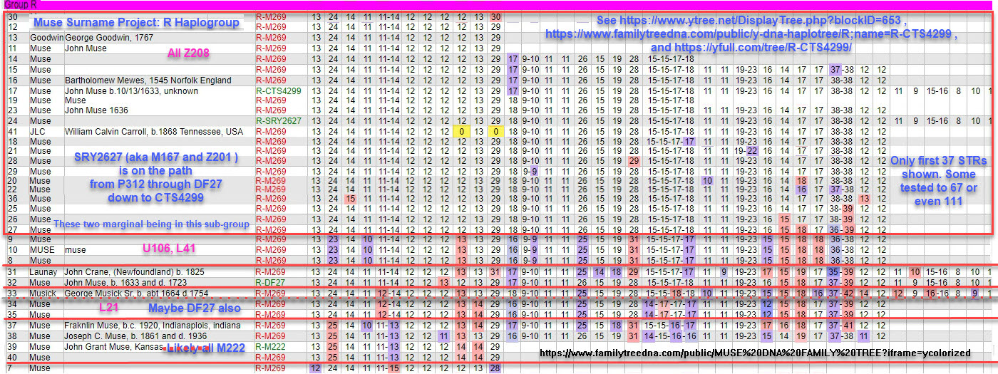 Of surprise in the return of the y37 result (after having two nulls on y12 and therefore no matches there) was that all matches at y25 and y37 are the surname Muse — 15 in total. So we are starting to investigate with these matches as to the time and geographic location of their ancestors to see if an overlap with the Carroll's can be made. It appears most of these fifteen matches are in a Muse surname project already. Others should be. (Note: we assume the nulls are a match for purposes of comparing haplotypes here.)As the Muse surname project is dormant, we did our own deeper analysis of the R haplogroup members there. Using their available public results page. Depicted here is that public results page but annotated and grouped into more refined haplogroups. Analysis includes not only displayed, tested haplogroups and haplotype comparisons; but deeper prediction of the haplogroup from STR values by NevGen. Even though included in the public chart of the surname project, we have cut out the FTDNA Kit numbers from our annotated version shown here.