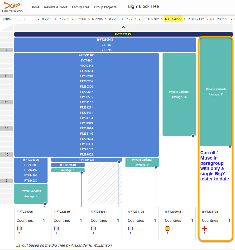 We can correlate other results to get a predicted deeper haplogroup than the R-CTS4299 already measured. This is possible using the public "R-Z198 incl. R-SRY2627" (FTDNA) group that places our tester in one of dozens of CTS4299 subgroups. The last five entries in grouping "A381. R-FT230653 (CTS4299+ BY12112+)" within that project are very tightly tied in STR values out to y111. Our Carroll tester is one of those five as is the other CTS4299 tester in the Muse group. But also there is the Muse tester with kit ID 323022 that BigY tested. There are many others in this group that BigY tested but none matched this other Muse testers and the close STR matching of the last five entries. So we can take R-FT232193* from kit 323022 as a closer terminal haplogroup likely for our tester. This project subgroup STR results are shown here along with the corresponding BigY Block Chart for that area. Note that this paragroup is likely formed around 3,000 years ago. So still well before surnames.External Links