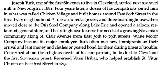 A page to collect the research and start a more formalized study into the Early Slovenes of Cleveland, Ohio. Key is we are trying to find out what started their migration to Cleveland. We know, starting in the 1890's, they came because other relatives or those from their village were already here. Cleveland was plentiful with jobs and the Eastern Europeans were to come and displace the Irish and other earlier immigrants in the dirty, hard jobs of the steel mills and iron processing; especially the building of rails for the railroad and other heavy-iron industries. Automotive and similar jobs would not arrive until much later. So if you have any additional information to add, please let us know to add to it here. We hope to source all information as well as do a more detailed search in the Diocese and Cleveland archives for further information.
