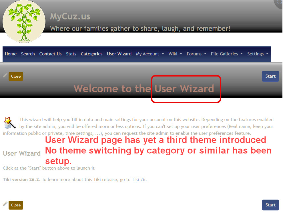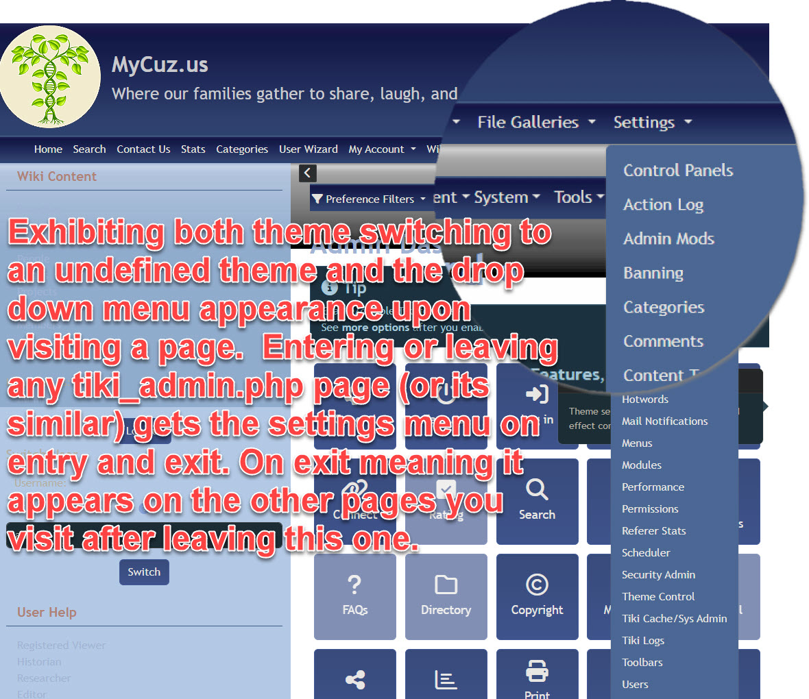 (2) Settings page (tiki_admin.php) view with both theme change and drop-down menu issue (note: happens on other pages like "Contact Us" with anonymous users)