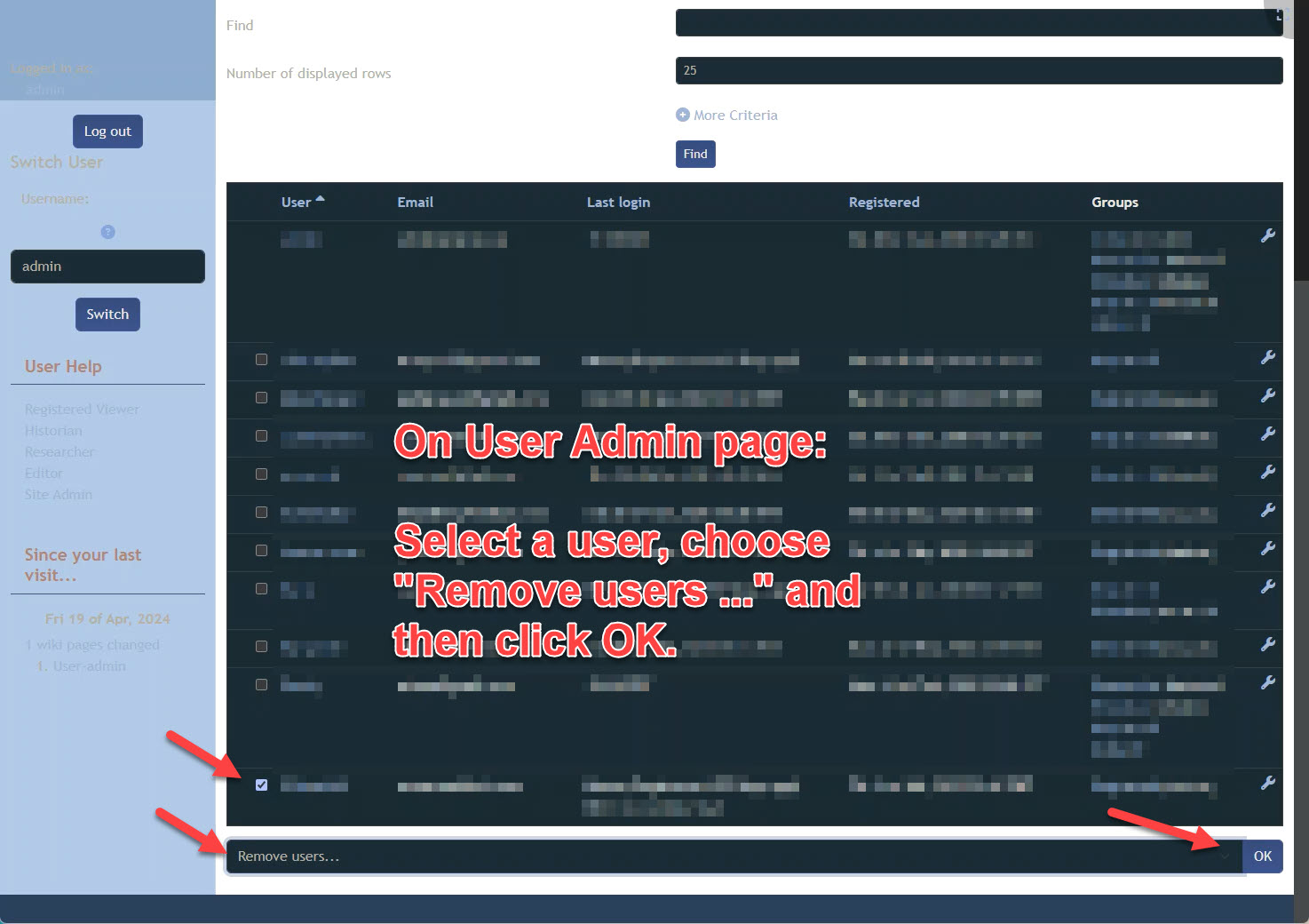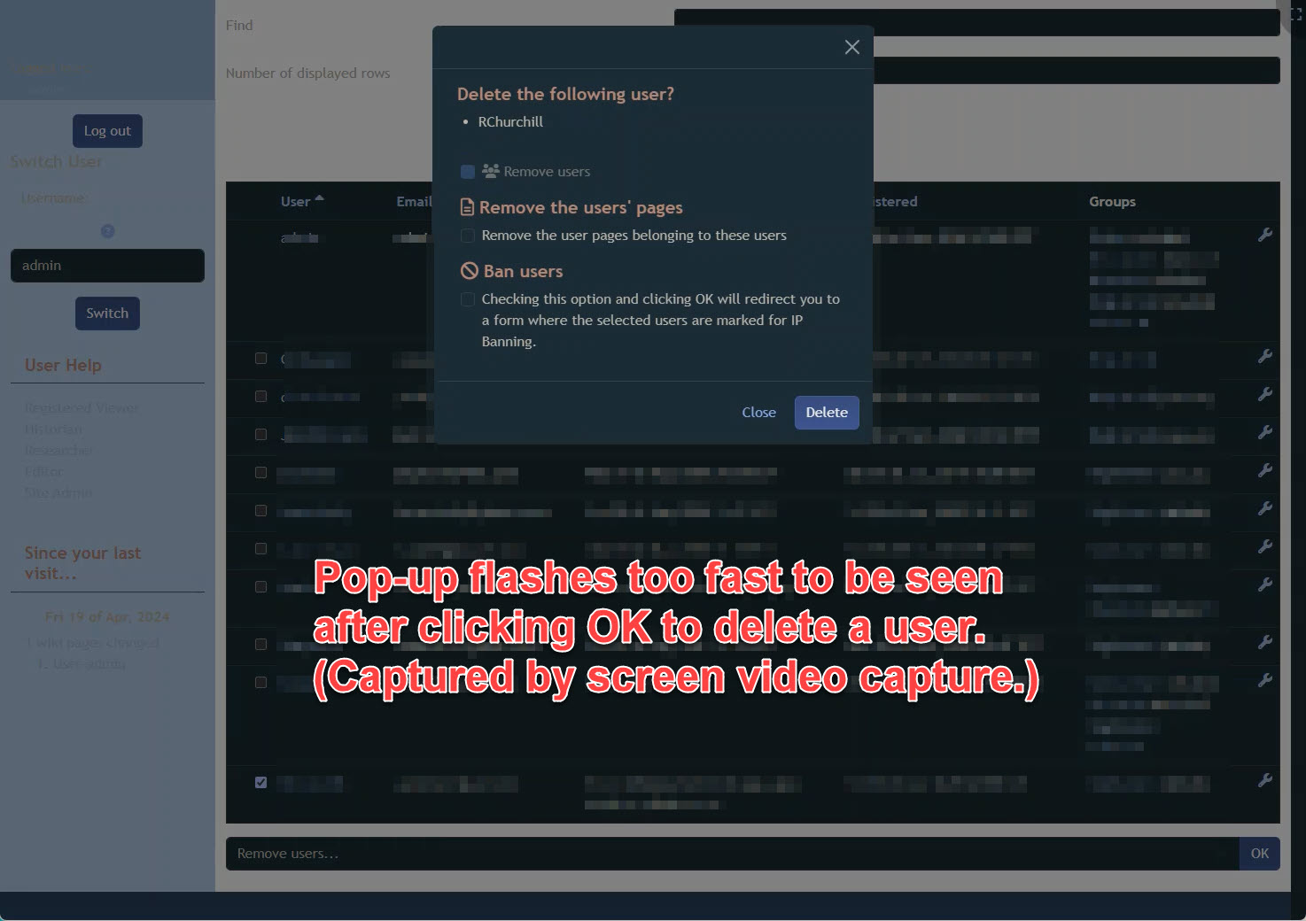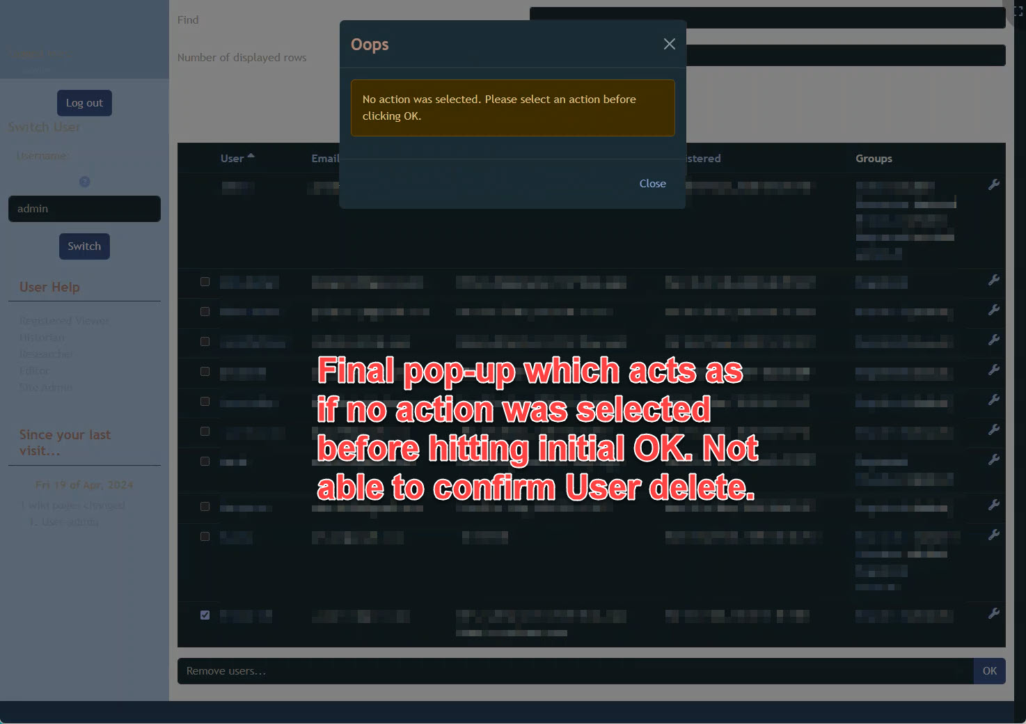(b) Users / Remove Users flashes what appears may be a quick confirmation pop-up before being quickly replaced with a stable pop-up of "You must select an action to perform before ..." (acting as if the Remove Users was not selected before hitting OK). Maybe clearing that action out before waiting for the OK on the confirmation pop-up?