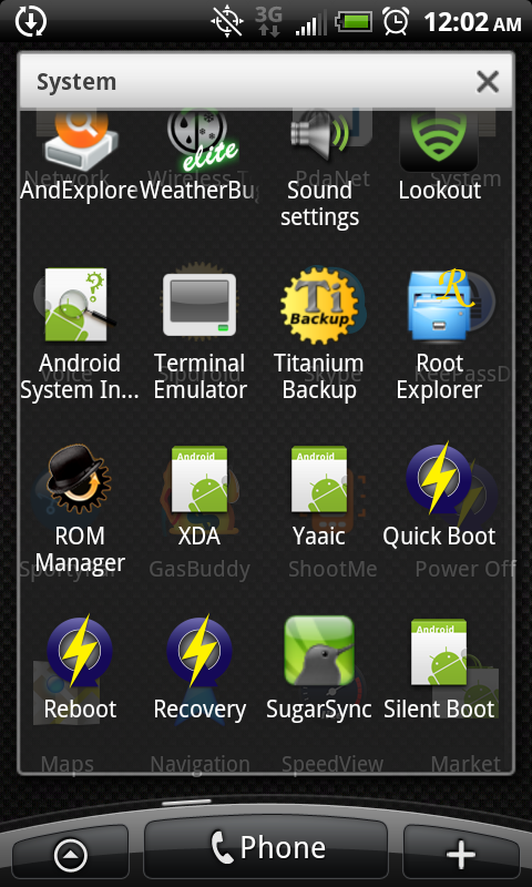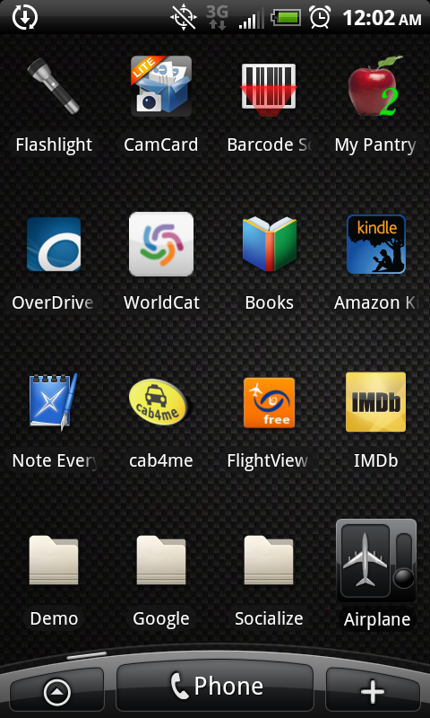Randy's launcher screen shots and Application list before upgrading and repair of phone to fix Camera Flash LED's. No custom theme-ing. Just pure functional customization to maximize battery and utility.